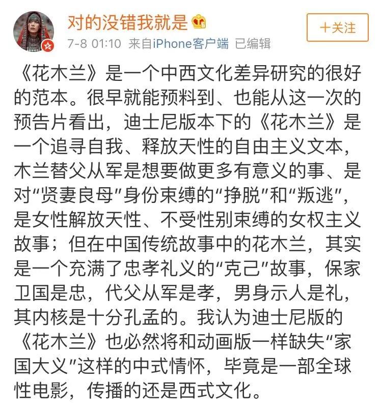 有的网友则从预告片中看到中西方文化和价值观的差异,认为木兰从军作为一个充满“家国大义”的中国传统故事,被迪士尼改编后,主要表现的价值观变成了女性的个性解放和对礼教束缚的挣脱。