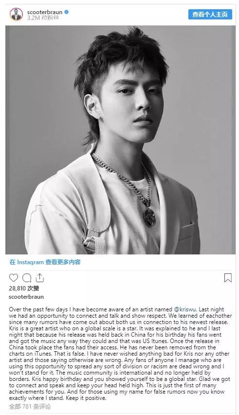 虽然事后,A妹经纪人Scooter Braun发帖回应称,吴亦凡的榜单成绩是因为新专在北美上架时间要早于中国几天,而在中国国内的上架时间要配合其生日日期,因而有粉丝自发在美国iTunes表示支持。