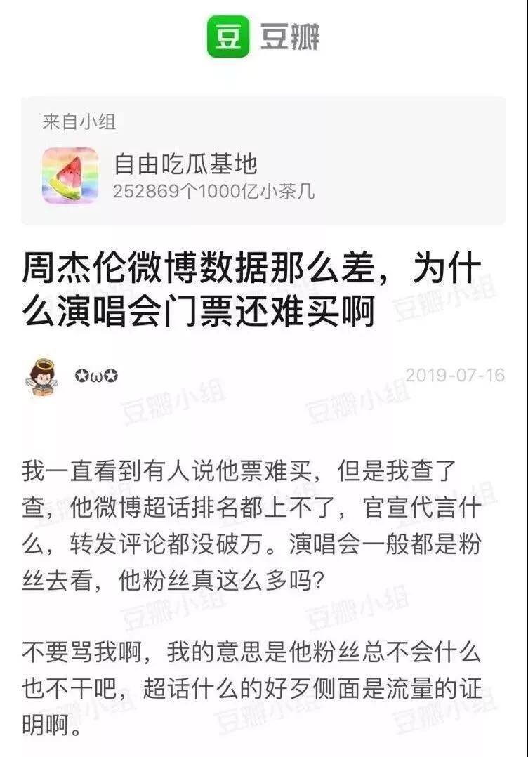 上周二,在豆瓣“自由吃瓜基地”小组中,一网友发提问贴:周杰伦微博数据那么差,为什么演唱会的门票那么难买啊???