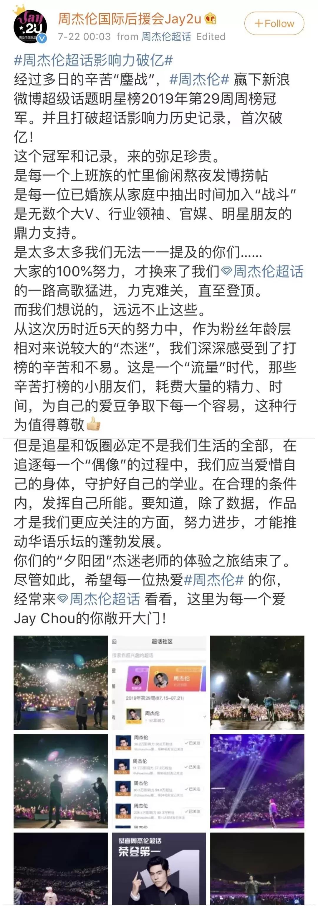 如今,周杰伦的超话已经破亿,这也是微博超话有史以来,首位影响力过亿的明星!