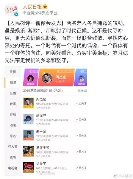 这场轰轰烈烈的数据之争甚至引起了《人民日报》微博的关注。《人民日报》在其官方微博上发表了题为“偶像会发光”的微评↓↓↓