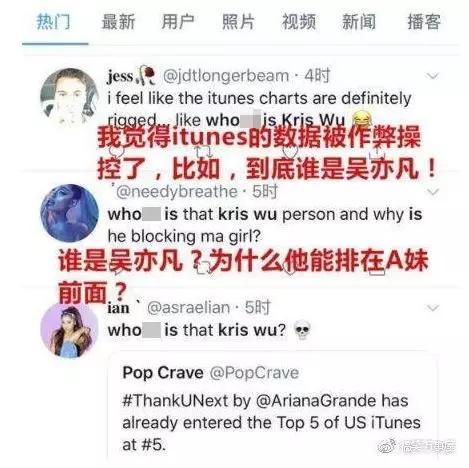 在吴亦凡的新歌超过A妹新单之后,许多歪果仁网友都在推特上问#谁是吴亦凡?,甚至还有人怀疑他在打榜时使用了“刷榜机器人”。