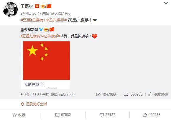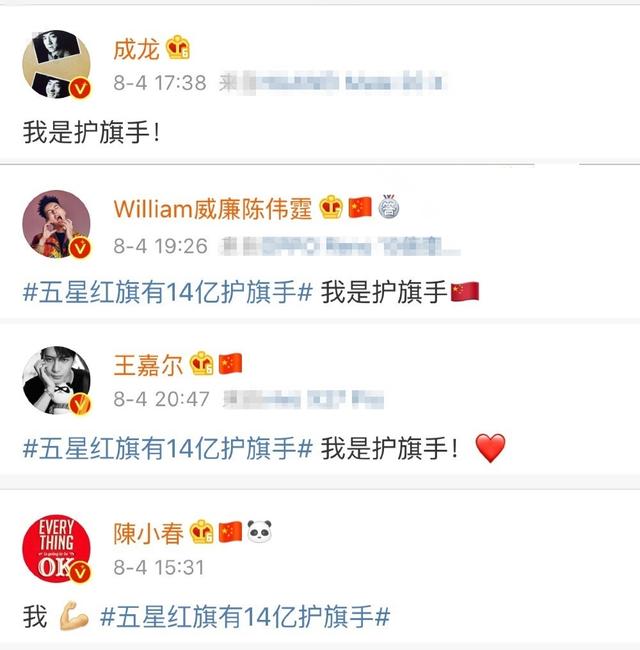不久前,央视发布“我是护旗手”微博,转发的香港艺人中有成龙、陈伟霆、陈小春、王嘉尔等人。