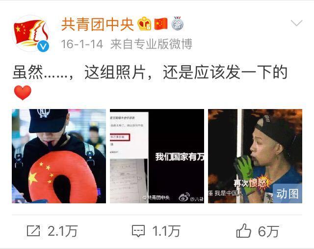 早在2016年,共青团中央就曾发微博认证了王嘉尔的爱国。