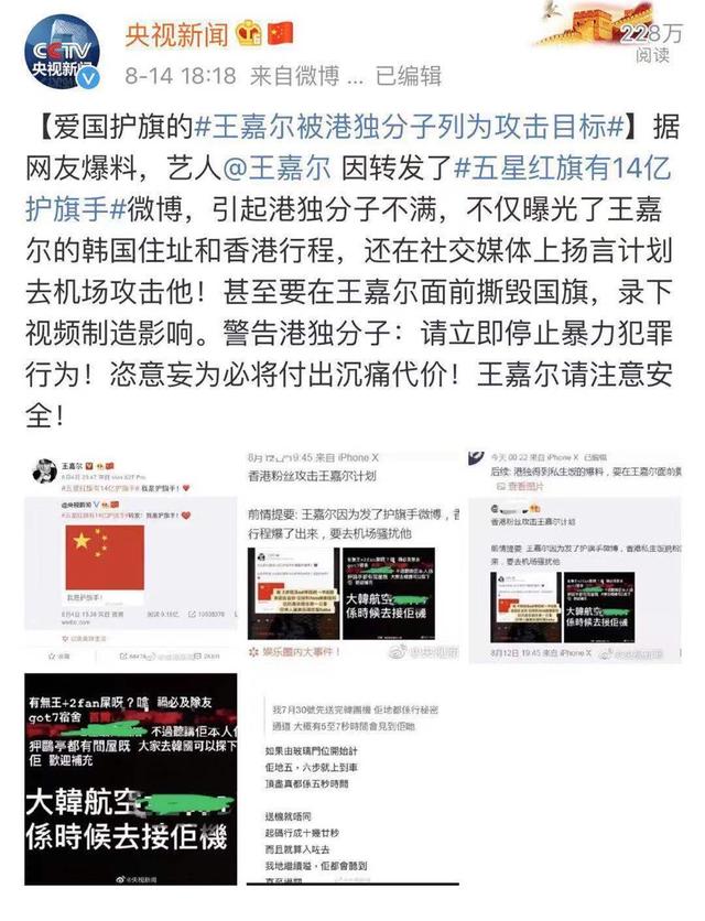 8月14日,据网友爆料,艺人王嘉尔因转发了央视的“五星红旗有14亿护旗手”的微博,而引起港独分子的不满,一些极端的香港私生饭脱粉回踩,他们不仅曝光了王嘉尔的韩国住址和香港行程,还在社交媒体上扬言计划到香港机场围堵攻击他,甚至叫嚣着要在王嘉尔面前撕毁国旗,并录下视频制造影响。